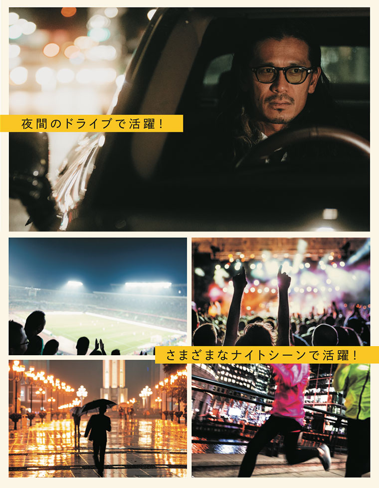 夜間運転の他、ナイトランや野外コンサート、スポーツ観戦や視界が悪く光が散乱しやすい雨の日などにも効果的です。