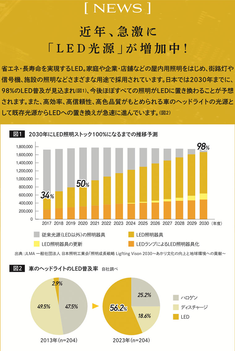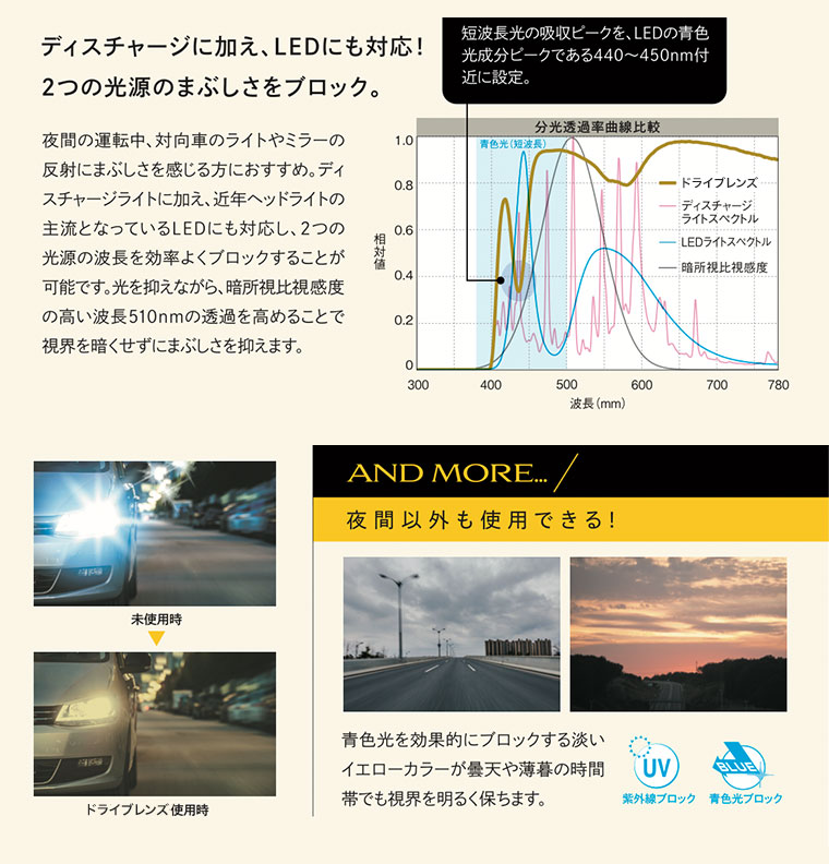 夜間の運転中、対向車のライトやミラーの反射にまぶしさを感じる方におすすめ。従来のディスチャージライトに加え、近年ヘッドライトの主流となっているLEDにも対応し、2つの光源の波長を効率よくブロック。