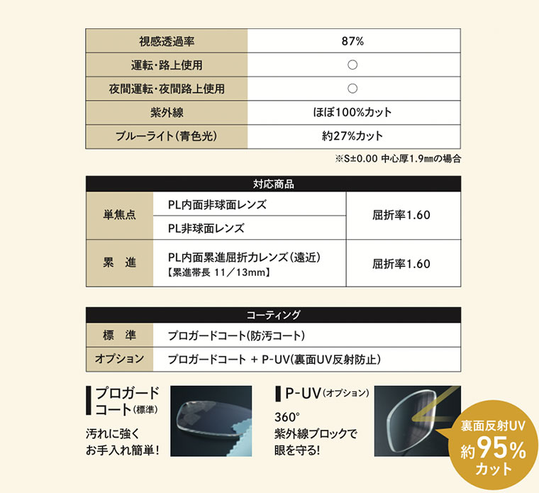 表面の反射防止、UVカット、裏面UV反射防止、キズ防止に加え、ブルーライトカットが標準装備。