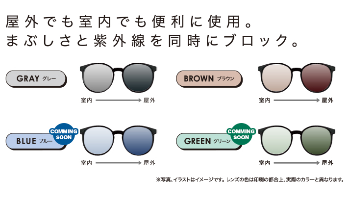 かけた瞬間から自然なカラーを楽しみながら、屋外ではさらに濃く変化し、まぶしさをしっかり軽減します。ファッション性と機能性を両立した、新しいスタンダードです。